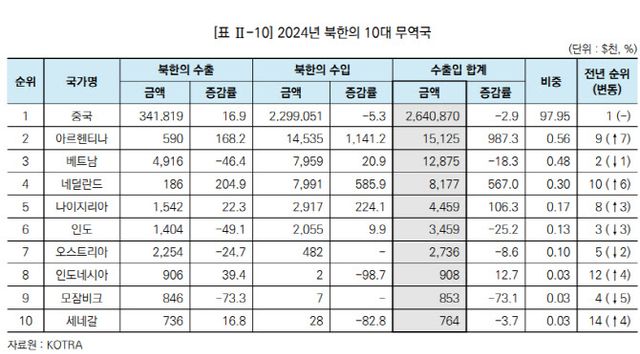 중국에 이어 북한의 5대 교역국에는 아르헨티나, 베트남, 네덜란드, 나이지리아가 포함됐다. 이외에 인도네시아, 세네갈은 각각 8위, 10위로 새롭게 10대 교역국에 진입했다. 10대 교역국 중 아시아 국가는 4개국으로 전년도에 비해 1개국이 늘었다. 다만 이들 국가와의 교역 비중은 98.6%로 대부분 중국이 차지했다.