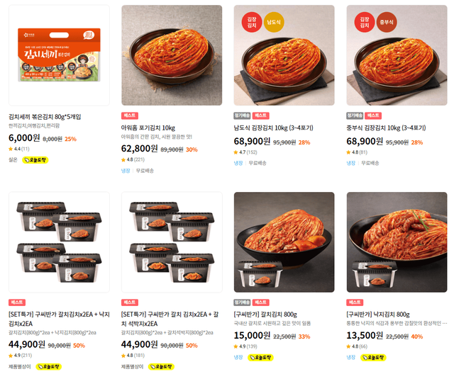 특히 소비자 반응이 좋은 품목은 '아워홈 포기김치 10kg'와 '구씨반가 갈치 김치 800g×2EA+낙지김치 2EA' 세트다. 각각 62,800원, 44,900원의 가격으로 최대 50% 할인 혜택이 적용된다. 냉장 보관과 배송이 가능한 제품이기 때문에, 김치 소비가 잦은 여름철에도 편리하게 이용할 수 있다는 장점이 있다.
