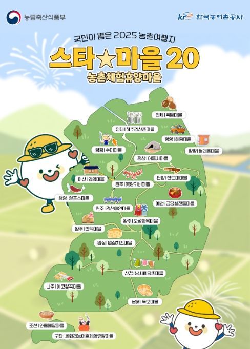 지역특산물을 활용한 약선밥상과 핀란드식 사우나를 체험할 수 있는 ‘달래촌마을’을 포함하여 전통 다랭이논의 멋진 경치를 한눈에 담을 수 있는 ‘두모마을’, 국내 최초 치즈체험을 실시한 ‘임실치즈마을’, BTS의 영상 및 화보 촬영지인 ‘오성한옥마을’ 등이 선정됐으며, ‘스타마을 20선’에 대한 자세한 내용은 ‘농촌여행의 모든 것’을 볼 수 있는'웰촌'누리집에서 확인할 수 있다.