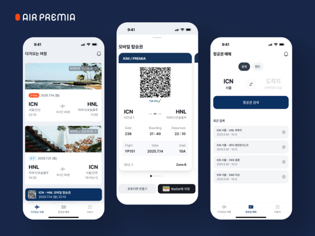 예약고객의 '다가오는 여정'이 첫 화면에 우선 표시되며, 에어프레미아 공식 홈페이지뿐 아니라 여행사나 기타 채널에서 구매한 항공권도 여정 조회 기능을 통해 등록 후 체크인 및 모바일 탑승권 사용이 가능하다.