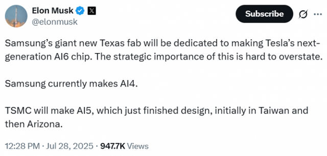 한편, 삼성전자는 이번 수주로 테슬라의 차세대 AI6 칩을 생산하고, 내년 가동 예정인 미국 텍사스주 테일러 공장에서 생산을 맡을 예정이다.