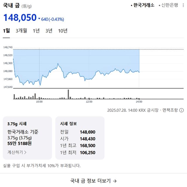 이러한 영향으로 국제 금값이 이날 한때 하락한 것이 국내 금시세에도 영향을 미쳤다.