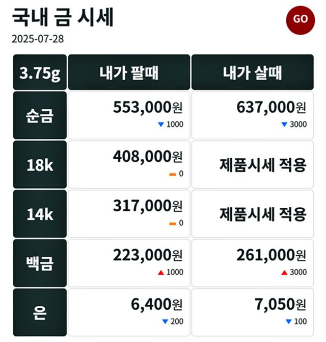 순금(24K) : 매입가 63만 7000원 / 매도가 55만 3000원