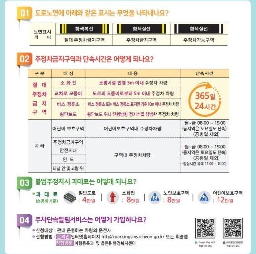 이천시가 지정한 절대 주정차 금지구역은 ①소화전 반경 5m, ②교차로 모퉁이 5m, ③버스 정류소 10m, ④횡단보도이고 이 구간에 잠시 잠깐이라도 주정차하는 경우 과태료가 부과되며, ‘안전신문고’ 앱을 통해 횟수 제한 없이 1분 간격에 한 번씩 신고할 수 있다. 이러한 구역에서의 불법주정차는 과태료가 부과되는 문제를 넘어 응급상황 시 긴급차량의 진입을 방해하고 보행자의 안전까지 위협할 수 있어서 더욱 철저한 주의가 필요하다.