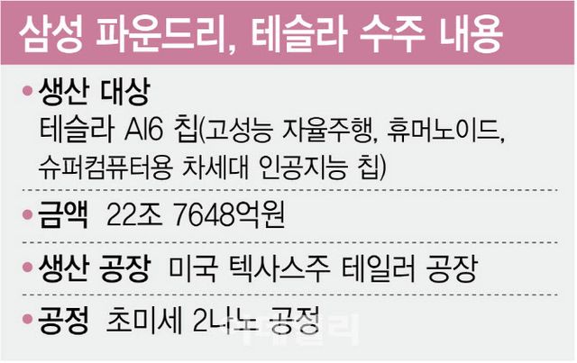 삼성전자는 28일 테슬라와 22조7648억원 규모의 파운드리 공급 계약을 수주했다고 공시했다. 이는 지난해 매출 대비 7.6%에 달한다. 업계에서는 단일 고객사 기준으로 역대 최대의 ‘잭팟’ 계약이라는 평가가 나온다.