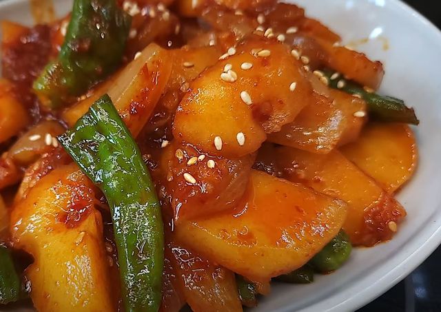 매콤한 감자볶음은 감자의 아삭한 식감과 매콤한 양념이 어우러져 많은 이들의 사랑을 받는 반찬이다.