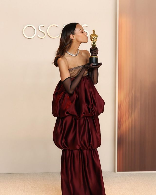 오스카 트로피를 들던 순간엔 메시 톱이 더해진 볼륨감 있는 버건디 드레스를 입었고, 골든글로브 시상식에서는 깊은 컬러와 절제된 실루엣으로 고전미를 드러냈습니다. 스팽클로 위트를 더한 레드 룩도 있죠. 어떻든 조 샐다나는 같은 빨강은 절대 반복하지 않습니다.