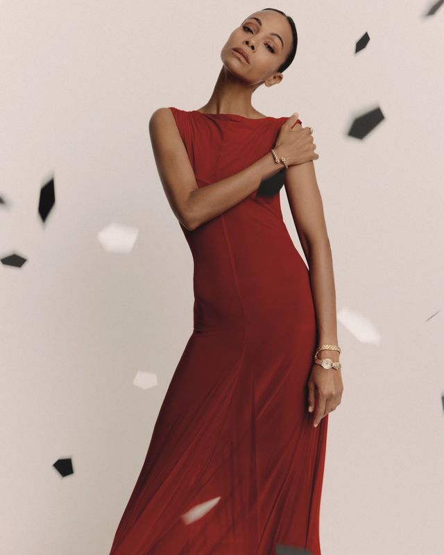 공식 비주얼 속 조 샐다나는 까르띠에의 상징 컬러인 버건디 드레스를 입고 카메라를 가만히 응시합니다. 부드러운 드레이핑과 시어한 텍스처, 거기에 골드 워치로 완성한 룩만으로도 까르띠에가 조 샐다나를 선택한 이유가 다분히 설명되는데요.