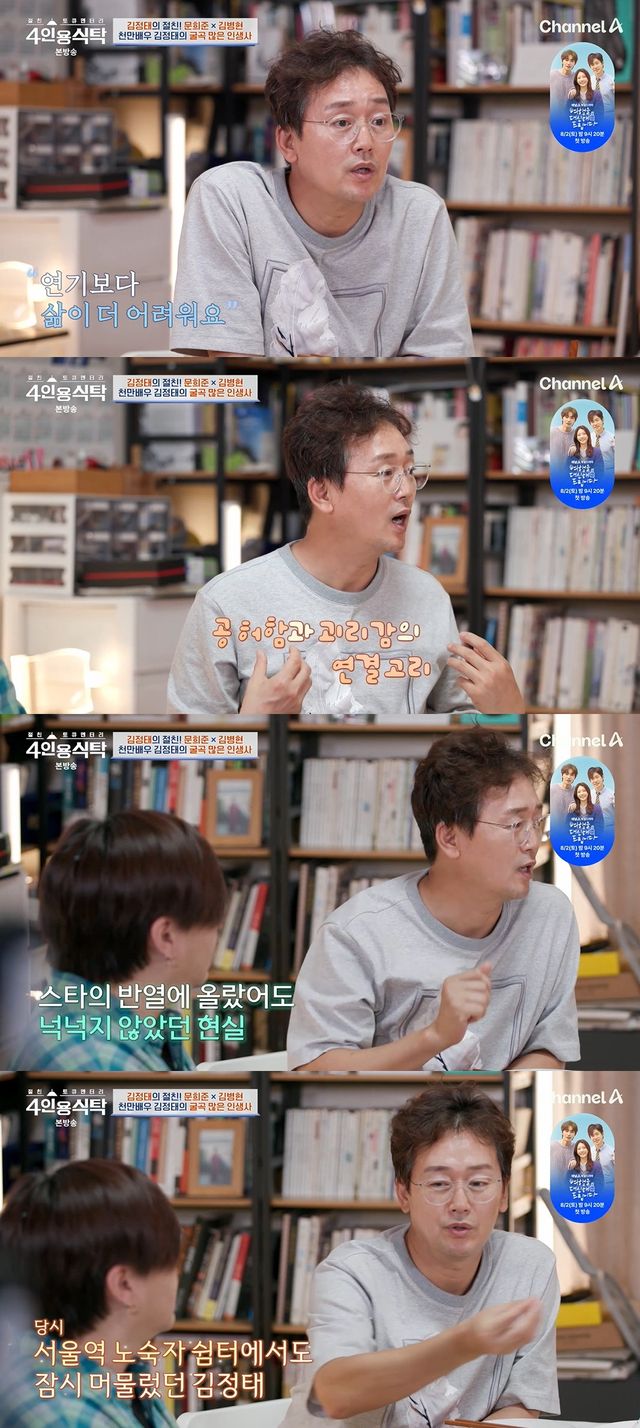 이날 김정태는 "직업인으로서의 내가 있고 가족 구성원으로서의 내가 있지 않냐. 데뷔 이후에 많이 느꼈다. 연기 잘했다고 찬사가 쏟아졌지만 돌아서면 나는 닭 배달을 가야 했다. 공사 현장에 배달을 하러 가면서 그런 생각이 들었다. 그런 괴리감이 크더라"라며 "유명세와 금전적 수입이 정비례하지 않는다"라고 말했다.