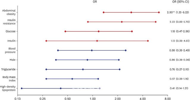 특히 이번 연구에서 복부 비만이 고안압증과 가장 강한 연관성을 보였다. 복부 비만 증상(허리둘레 남성 ≥ 90cm, 여성 ≥ 85cm)을 가진 대상자 중 고안압증 유병률은 2.0%로 정상군의 0.8%에 비해 높았다. 연구진이 성별 및 기타 대사증후군 요인을 보정한 결과 복부 비만은 고안압증 발생 위험이 정상인보다 2.9배 더 높았다. 이외에도 인슐린저항성도 안압에 영향을 미치는 대사증후군 요소로 분석됐다. 인슐린저항성을 가진 환자는 정상인보다 고안압증 발생 위험이 약 2.23배 높았다.
