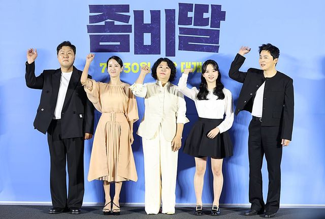 배우 윤경호(왼쪽부터)과 조여정, 이정은, 최유리, 조정석이 지난 6월 30일 오전 서울 용산구 CGV 용산아이파크몰에서 진행된 영화 '좀비딸'(감독 필감성)의 제작보고회에서 포즈를 취하고 있다. '좀비딸'은 이 세상 마지막 남은 좀비가 된 딸을 지키기 위해 극비 훈련에 돌입한 딸바보 아빠의 코믹 드라마다 / 뉴스1
