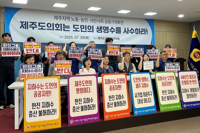 도내 26개 노동·농민·시민사회단체는 29일 오전 제주도의회 도민카페에서 기자회견을 열고 “제주도의회는 법률적 근거 없는 지하수 연장 허가 및 증산을 불허해 도민의 생명수를 사수하라”고 요구했다.