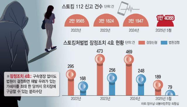 29일 양부남 더불어민주당 의원실이 경찰청으로부터 제출받은 자료에 따르면 경찰이 스토킹 가해자에게 유치장 구금을 의미하는 ‘잠정조치 4호’만을 단독으로 신청한 내역은 △2022년 295건 △2023년 473건 △2024년 469건 △2025년(~5월) 189건으로 집계됐다. 신청 건수는 우상향하는 추세지만 법원 결정률은 해마다 낮아지고 있다. 2022년 56.9%였던 결정 비율은 △2023년 54.1% △2024년 52.8% △2025년(~5월) 41.8%까지 떨어졌다.