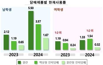 고등학교 2학년 기준으로 궐련 사용률은 남학생 5.5%, 여학생 1.33%였으며, 액상형 전자담배는 남학생 3.57%, 여학생 1.54%를 기록했다.