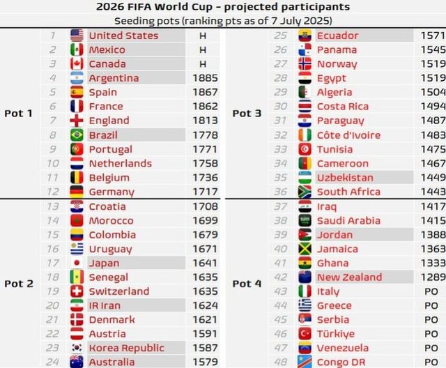 축구전문메체 '풋볼미트데이터'는 최근 사회관계망서비스(SNS)를 통해 '2025년 7월 기준으로 2026 월드컵 포트'를 소개했다.