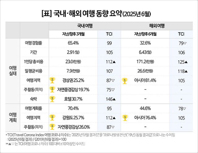 코로나19 이전인 2019년 6월과 비교하면, 국내 숙박여행 경험률과 계획률은 각각 TCI 99, 95 수준으로 근접했다. 지역별로는 강원도, 수도권, 전라권, 충청권이 104\~120 수준의 회복세를 보였지만, 경상권(87), 제주도(72)는 여전히 부진했다.