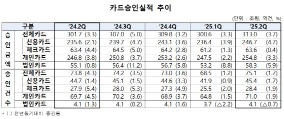 여신금융협회는 올해 2분기 전체카드 승인금액과 승인건수가 각각 313조원, 75억1000만건으로 전년 동기 대비 3.7%, 1.7% 증가했다고 30일 밝혔다.