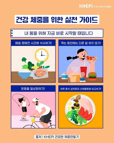 한국건강증진개발원이 제시한 올바른 체중 관리를 위한 방법은 ▲매일 정해진 시간에 식사하기 ▲먹는 동안에 다른 일 하지 않기 ▲ 운동을 일상화하기 ▲ 하루 음식 섭취량과 신체 활동량 비교하기 등이다.