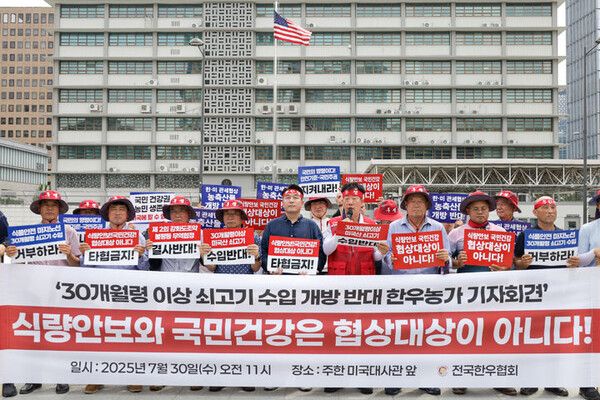 뉴시스 보도에 따르면, 한우협회는 30일 오전 서울 종로구 주한 미국대사관 앞에서 기자회견을 열고 "이번 미국의 협상태도는 상호주의가 아닌 일방적·강압적 압력"이라며 "30개월령 소고기 수입을 강행하려는 시도는 검역주권을 침해하는 불공정 협상으로 즉시 중단돼야 한다"고 주장했다.