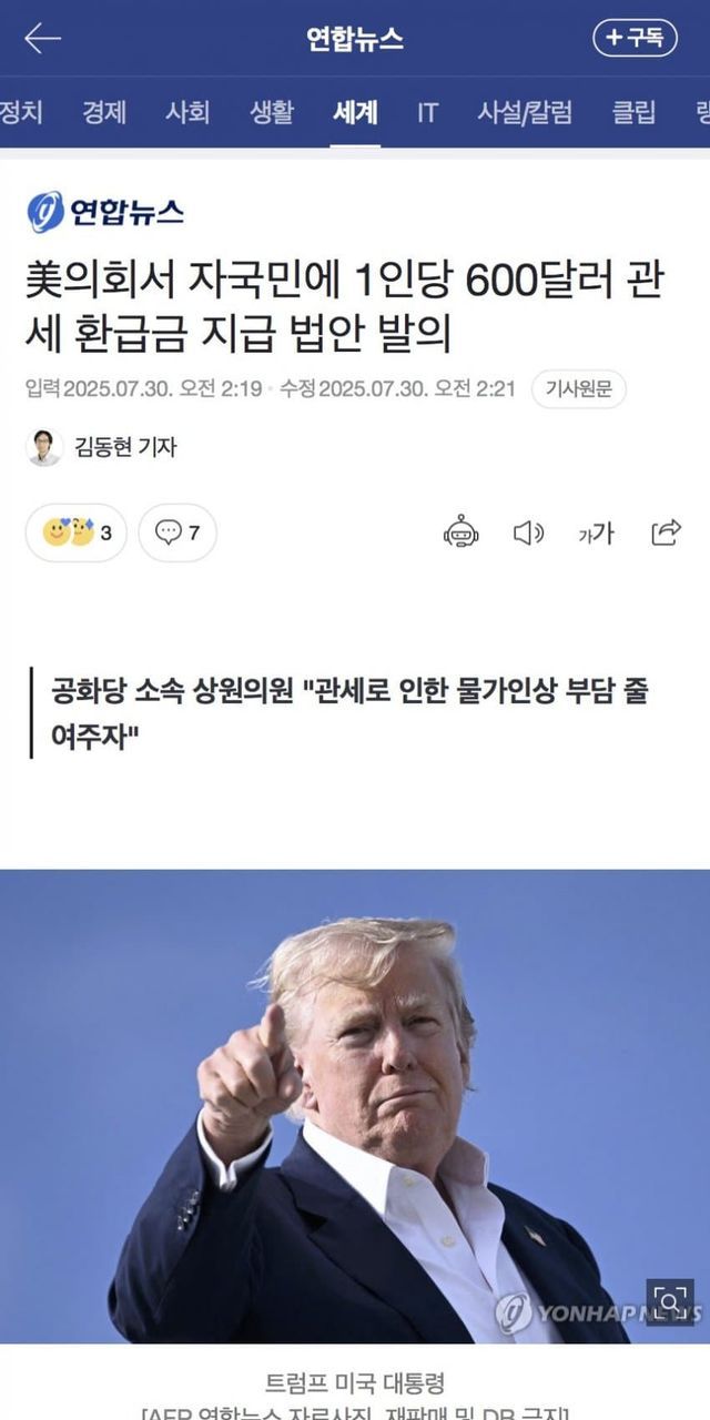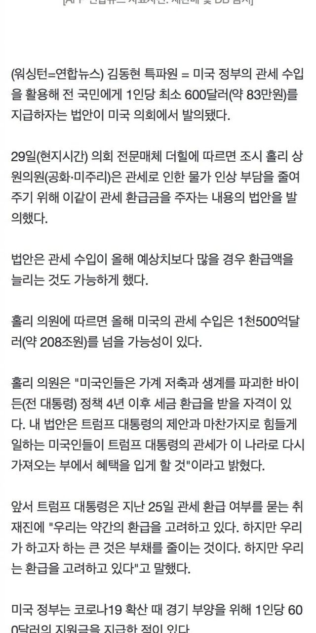 美, 전 세계서 거둔 관세로 환급금 쏜다…"전 국민 1인당 83만원" , 美 의회서 전 국민 1인당 600달러 '관세 환급금' 지급法 발의…트럼프도 '긍정'