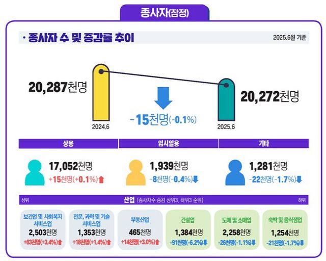 김재훈 고용부 노동시장조사과장은 “종사자 수 감소 추세는 건설업·도소매업·숙박음식점업의 감소 때문인데, 건설업 경기가 좋아져야 다시 증가세로 돌아설 것으로 보인다”고 했다. 김 과장은 “정부가 ‘소비쿠폰’을 발행했기 때문에 숙박·음식점, 도·소매업은 개선될 여지가 있다”고 했다.