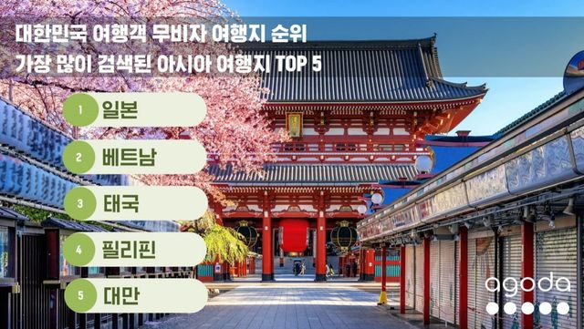 여행 플랫폼 아고다가 올해 1월부터 5월까지의 아고다 플랫폼 내 대한민국 여행객 숙소 검색 데이터를 분석한 결과, 한국인 여행자들에게 가장 큰 인기를 얻은 아시아 무비자 여행지 1위는 '일본'으로 나타났다.