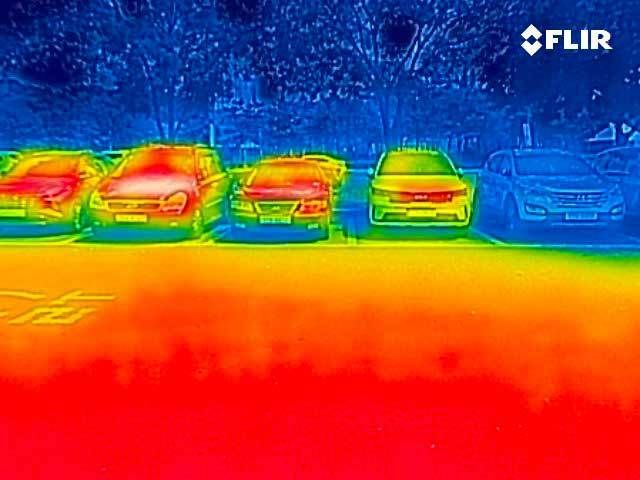 서울 시내 한 야외주차장에 그늘 아래 차량과 햇빛 아래 차량이 기온차를 보이고 있다. 열화상 카메라는 온도가 높을수록 붉은색으로 나타나며 상대적으로 온도가 낮은 곳은 푸른색으로 나타난다. (열화상 카메라 촬영) / 뉴스1