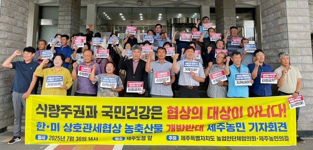 제주도농업인단체협의회와 제주농민의길은 30일 오후 제주도청 앞에서 ‘한미 상호 관세협상 농축산물 개방 반대’ 기자회견을 열었다.