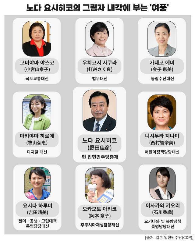이 밖에도 노다 총재가 이끄는 그림자 내각엔 ▲가네코 에미(金子恵美) 농림수산대신 ▲고미야마 야스코(小宮山泰子) 국토교통대신 ▲마키야마 히로에(牧山弘惠) 디지털대신 ▲오카모토 아키코(岡本章子) 후쿠시마 재생담당대신 ▲니시무라 지나미(西村智奈美) 어린이정책 특명담당대신 ▲이시카와 카오리(石川香織) 오키나와 및 북방정책 특명담당대신 등 일본 정치권과 일반 대중들의 주목을 받는 여성 정치인들이 다수 참여하고 있다.