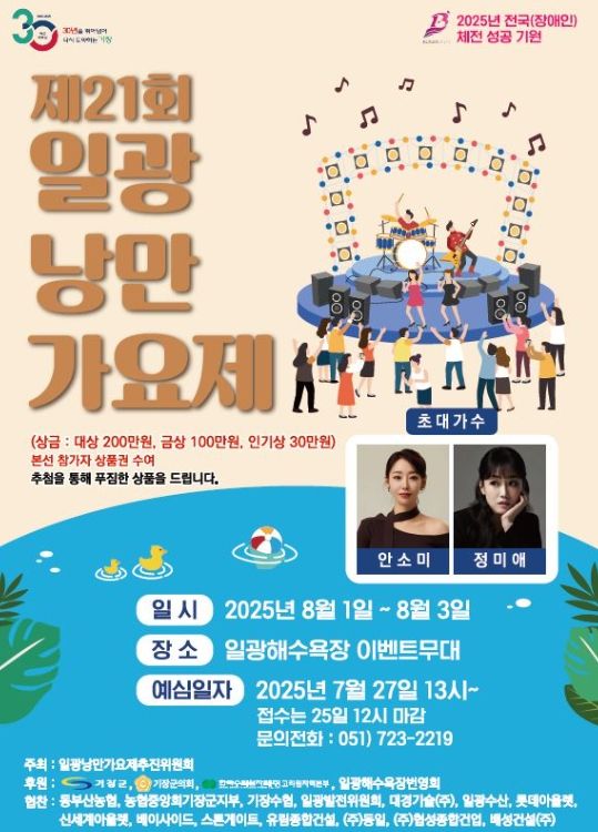 정종복 기장군수는 “이번 일광낭만가요제는 시원한 바다를 배경으로, 활기찬 무대와 다채로운 행사가 어우러진 특별한 시간이 될 것이다”라며, “많은 군민과 관광객들이 찾아오셔서 여름 바다의 낭만을 마음껏 즐기시길 바란다”라고 말했다.
