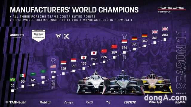 플로리안 모들링거 포르쉐 팩토리 모터스포츠 포뮬러 E 디렉터 팀 디렉터는 “포르쉐가 포뮬러E 제조사 및 팀 부문 월드 챔피언십을 획득한 것에 정말 큰 자부심을 느낀다”며 “모든 팀원과 팩토리의 열정적인 지원, 그리고 포르쉐 워크스 드라이버의 활약을 통해 함께 이룬 성과라 더 큰 영광”이라고 말했다. 정진수 기자 brjeans@donga.com