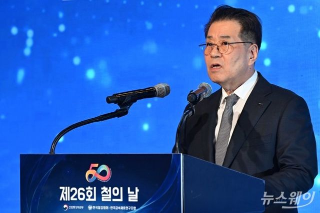 장인화 한국철강협회 회장(포스코그룹 회장)이 9일 오후 서울 강남구 그랜드 인터컨티넨탈 파르나스에서 열린 제26회 철의 날에서 기념사를 하고 있다. 사진=강민석 기자 kms@newsway.co.kr