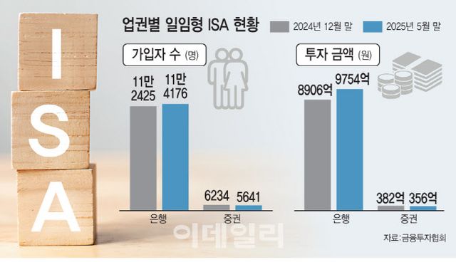 실제 은행에 투자를 일임해 자산을 늘리려는 소비자 수요도 늘고 있다. 금융투자협회 전자공시서비스에 따르면 지난 5월말 기준 일임형 ISA 가입자 수는 은행이 11만 4176명으로 전체 일임형 ISA 가입자 수(11만 9817명)의 95.3%를 차지했다. 가입자 수만 놓고 보면 은행이 증권(5641명)의 20.24배에 달했다. 실제 은행 일임형 ISA 가입자 수는 지난해 말 11만 2425명에서 올해 5월말 11만 4176명으로 증가했다. 같은 기간 증권 일임형 ISA 가입자 수가 6234명에서 5641명으로 감소한 것과 대조적이다. 투자금액 또한 은행은 지난해 8906억원에서 올해 5월말 9754억원으로 늘어난 반면 증권업계는 382억원에서 356억원으로 감소했다. 5월말 기준 은행 일임형 ISA 투자금액은 증권의 27.4배에 달한다.
