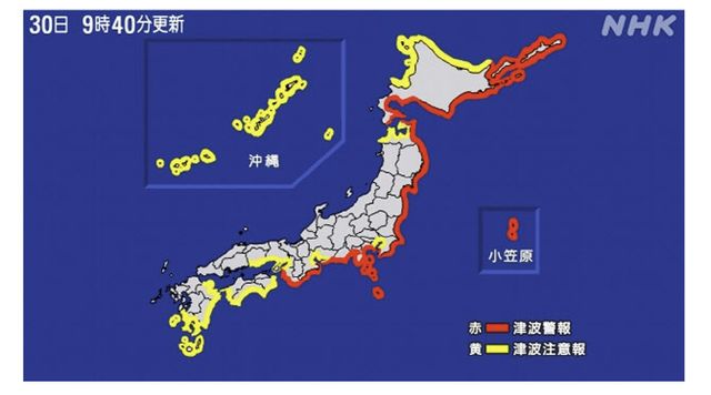 NHK에 따르면 일본 기상청은 이날 오전 9시 40분께 홋카이도 동부, 혼슈 동북부 도호쿠 지방, 수도권인 간토 지방 등의 해안가에 쓰나미 경보를 내렸으나 오후 8시 45분께 일부 지역에 유지했던 쓰나미 경보를 주의보로 대체했다.