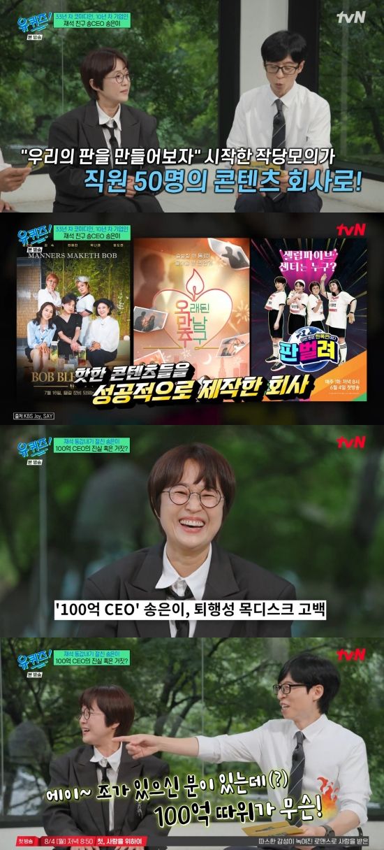 30일 방송된 tvN '유 퀴즈 온 더 블럭'(이하 '유퀴즈')에서는 송은이가 게스트로 출연한 가운데 '100억 CEO'라는 수식어에 대해 해명한 장면이 전파를 탔다.