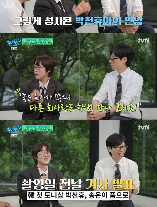 30일 방송된 tvN '유 퀴즈 온 더 블럭'(이하 '유퀴즈')에서는 송은이가 게스트로 출연한 가운데 박천휴 작가를 영입하게 된 사연을 밝힌 장면이 전파를 탔다.