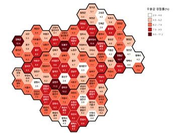 분석 결과 수도권 4개 시도(서울·인천·경기·강원)의 지표는 전국 시·군·구 중앙값(3.5%)보다 높은 수준을 유지하고 있어, 정신건강 분야 지역사업 추진 시 참고할 수 있는 기초자료로 활용 가능하다.