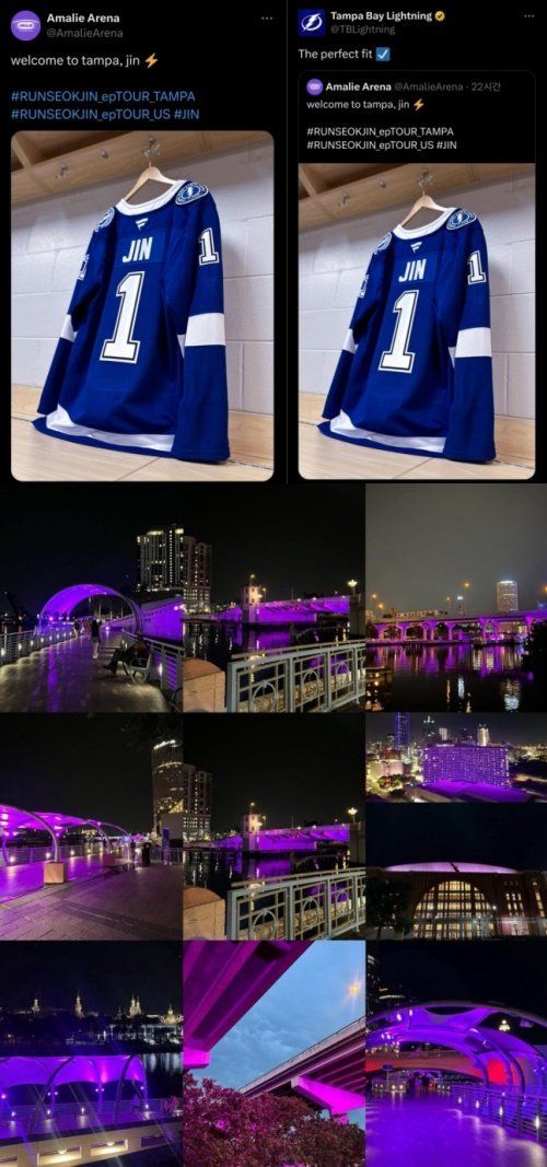 진을 향한 도시 전체의 환대도 인상적이었다. NHL 아이스하키팀 ‘탬파베이 라이트닝’은 진의 이름과 등번호 ‘1’이 적힌 파란색 커스텀 유니폼을 선물했고, 공식 계정은 진이 착용한 모습을 리트윗하며 “완벽한 핏”이라는 멘트를 남겼다. 진은 이 유니폼을 사운드 체크 무대에서 착용해 화답했다.