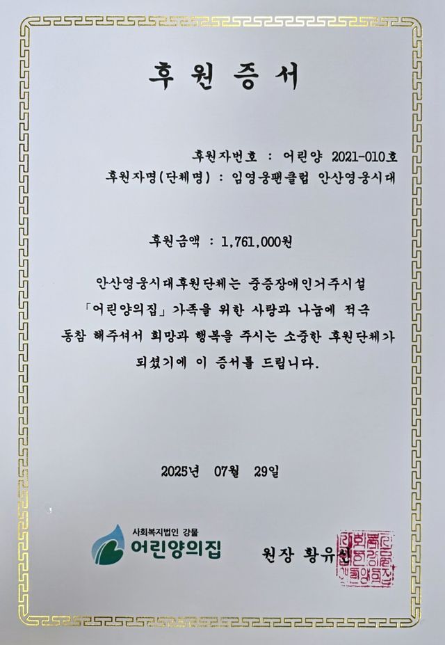 안산영웅시대 측은 “이용인분들께 2025년의 뜨거운 여름만큼이나 따뜻한 마음을 전할 수 있어 기뻤다”며 “우리가 여름날의 산타가 된 것 같아 뿌듯하다. 임영웅의 선한 영향력을 함께 실천한 하루였다”고 밝혔다.
