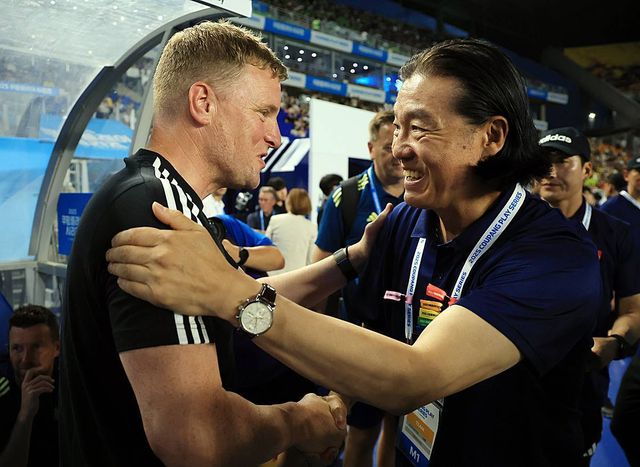 지난 30일 오후 경기 수원시 팔달구 수원월드컵경기장에서 열리는 쿠팡플레이 시리즈 팀 K리그와 잉글랜드 프리미어리그 뉴캐슬 유나이티드의 경기를 앞두고 뉴캐슬 에디 하우 감독과 팀 K리그 김판곤 감독이 인사를 나누고 있다 / 뉴스1