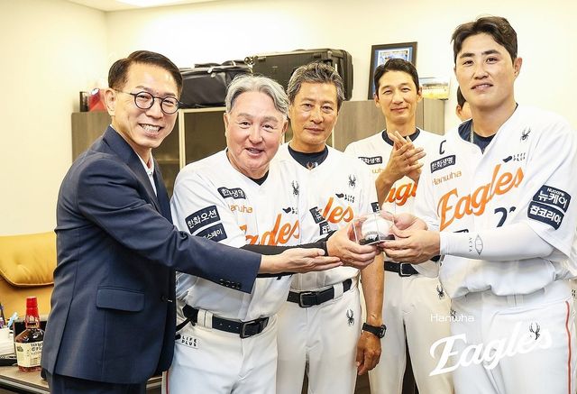 프로야구 한화 이글스 김경문 감독이 한화 이글스 사령탑 부임 후 100승을 달성했다. 김경문 감독이 이끄는 한화 이글스는 지난 30일 대전 한화생명 볼파크에서 열린 삼성 라이온즈와의 홈 경기에서 5-0으로 승리했다. 사진은 김경문 감독 한화 이글스 부임 후 100승을 축하해주는 박종태 대표이사와 코치, 선수들의 모습이다. / 한화 이글스 제공