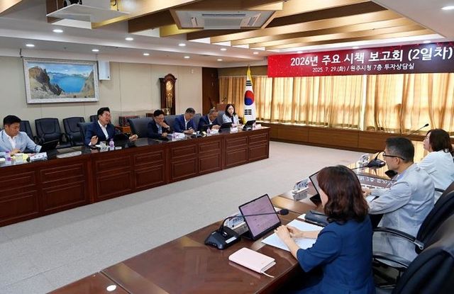 [파이낸셜경제=김영란 기자] 원주시는 지난 29일 녪년 주요 시책 보고회’2일차 일정을 진행했다. 이날 보고회에서는 홍보, 민원, 보건, 농업, 교육 등 시민의 삶과 직접 맞닿아 있는 부서의 2026년도 행정 방향과 시민 체감형 시책을 공유하고 실행 전략을 논의했다.