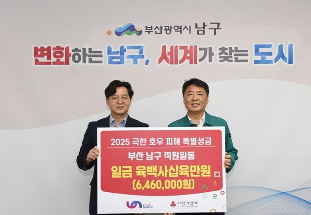 [파이낸셜경제=김영란 기자] 부산 남구는 최근 전국에서 발생한 집중호우 피해 복구와 이재민 지원을 위해 남구청 전 직원이 자발적으로 참여한 특별 성금 모금 운동을 펼쳐, 총 646만 원의 성금을 사회복지공동모금회에 전달했다고 29일 밝혔다.