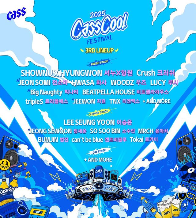 올해 ‘카스쿨 페스티벌’ 라인업에는 몬스타엑스 유닛 셔누&형원을 비롯해 크러시, 전소미, 우즈, 이승윤, 정세운, 빅나티, 화사, 루시 등이 출격한다. K-POP, 힙합, 록, EDM 등 다양한 아티스트들이 대거 출동해 공연을 펼칠 계획이다.