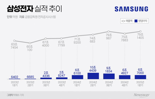 가전 사업 등을 담당하는 디바이스경험(DX) 부문은 43조6000억원의 매출과 3조3000억원의 영업이익을 기록하며 전년 대비 성장세를 보였다. 모바일경험(MX) 부문은 갤럭시 S25 시리즈와 A시리즈 판매 호조로 지난해보다 매출이 7% 올랐지만, 전 분기 대비로는 21% 줄었다.