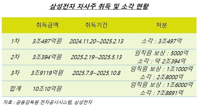 삼성전자는 3차에 걸쳐 매입한 10조원의 자사주 가운데 약 8조원은 소각하고, 나머지 2조원은 임직원 보상에 사용한다는 방침이다.