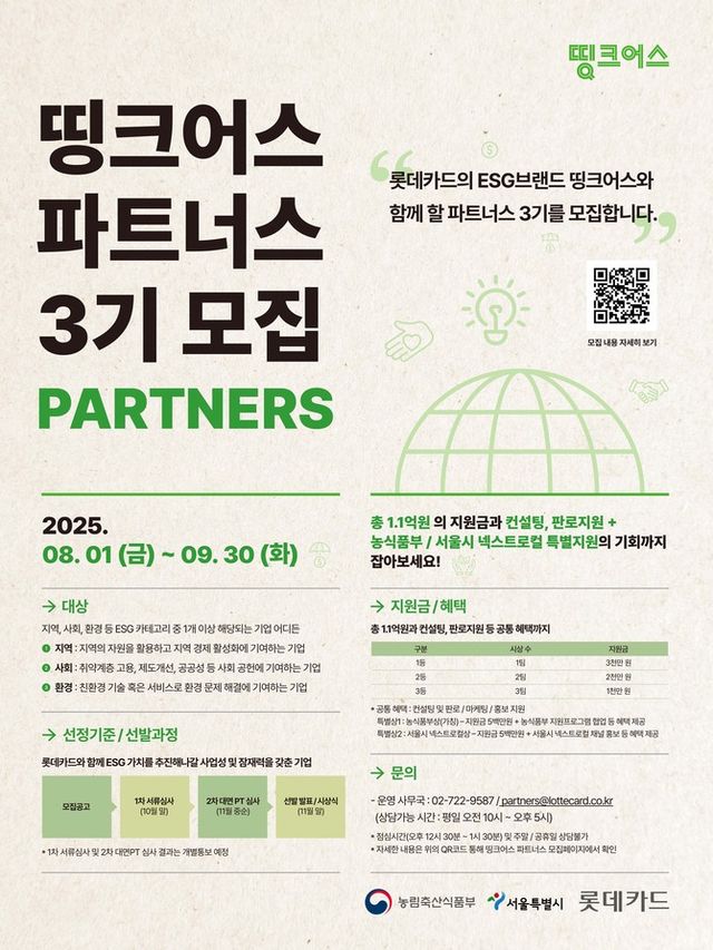 롯데카드는 ESG 경영 실천 기업 지원 프로그램 '띵크어스 파트너스 3기' 참여 기업을 내일부터 9월 30일까지 공개 모집한다고 31일 밝혔다. 띵크어스 파트너스는 롯데카드가 지역/사회/환경 분야에서 ESG 경영을 실천하는 작은 기업을 발굴해 성장을 지원하는 프로그램이다. 롯데카드는 2023년 띵크어스 파트너스 1기로 6개 기업을 선발하고, 2024년 2기로 7개 기업을 선발했다.