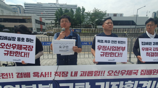 김범수 우체국본부 오산우체국지부장은 "우정사업본부 및 현장 관리자들이 압박과 갑질을 통해 현장 인력을 관리하는 행태가 여전히 존재한다"며 "우리의 요구는 집배실장을 당장 경질하고 피해자가 현장에 복귀해 안전하게 일할 수 있는 조건을 만들어달라는 것"이라고 강조했다.