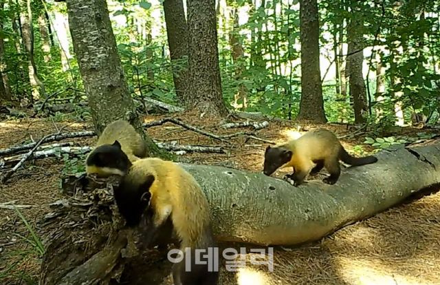 산림청 국립수목원은 최근 광릉숲 내 야생동물 무인센서카메라를 통해 아기 담비 두 마리가 어미로 보이는 담비와 함께 활동하는 모습을 포착했다고 31일 밝혔다.