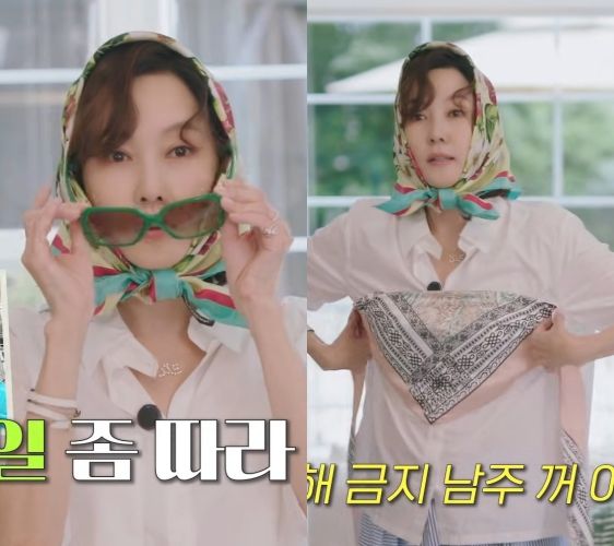 다음으로 딸의 스카프를 집은 김남주는 "요즘 애기들은 이런 걸 입나 보더라"라고 말하면서 스카프를 접어 가슴에 댔다. 제니 스타일이라고.